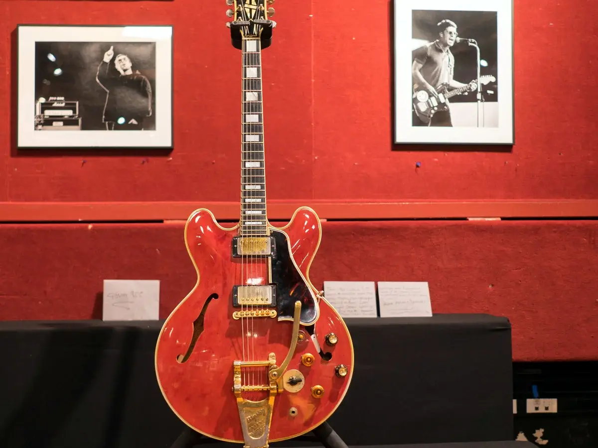 Gitar Gibson ES-355 berwarna merah ceri itu terkenal karena pernah rusak dalam perkelahian yang bikin Oasis akhirnya bubar pada Agustus 2009.
