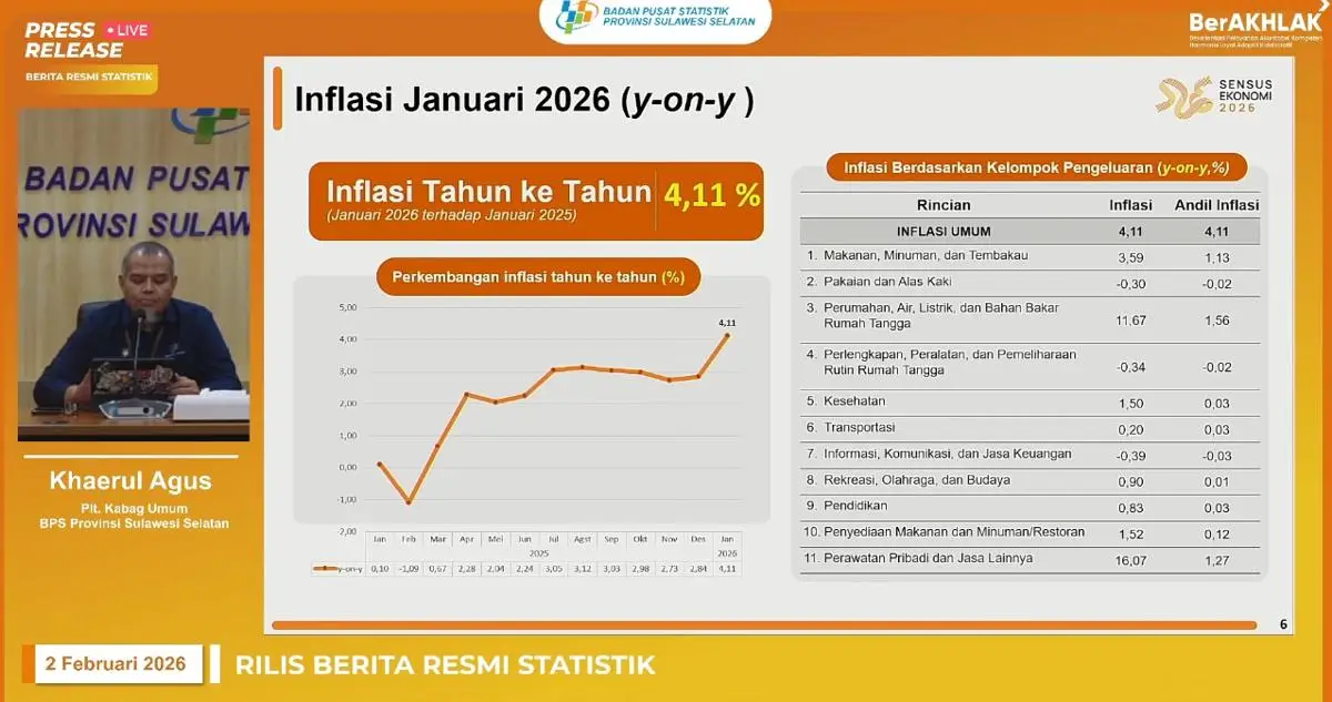 “Pada bulan Januari 2026 secara year on year terjadi inflasi sebesar 4,11%,” kata Plt. Kabag Umum BPS Provinsi Sulawesi Selatan Khaerul Agus dalam konferensi pers, Senin (2/2/2026).