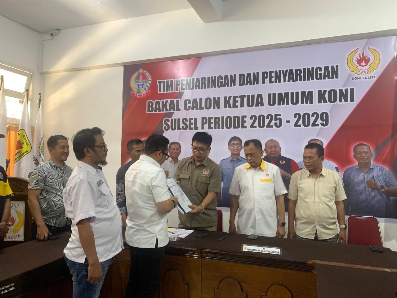 RUANGAKSELERASI.ID, MAKASSAR — Tim penjaringan dan penyaringan (TPP) calon ketua umum KONI Sulawesi Selatan menerima pengembalian berkas bakal calon Ketua Umum H. Darmawansyah Muin di sekretarian KONI Sulawesi Selatan, Jalan Hasanuddin Makassar, Senin (3/11/2025).
