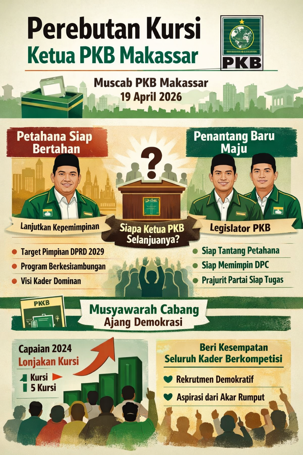Ia juga menekankan pentingnya menjaga kesinambungan program partai yang telah berjalan sejak beberapa tahun terakhir. “Target kita ke depan, PKB harus bisa menjadi pimpinan di Makassar pada 2029. Untuk itu, program yang sudah berjalan tidak boleh terputus,” ujarnya, Rabu (8/4/2026).