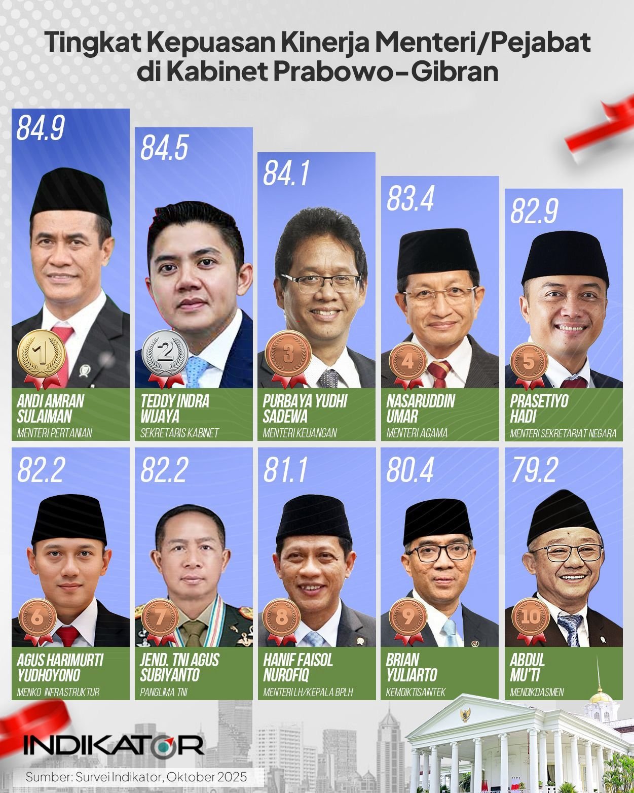 Kemudian Prasetyo Hadi – Menteri Sekretariat Negara (82,9%), Agus Harimurti Yudhoyono – Menteri Koordinator Bidang Infrastruktur dan Pembangunan Kawasan (82,3%), Tengku H. Najat Subijanto – Kepala Badan/Pimpinan terkait pembangunan nasional (82,2%), Hanif Faisal Nurofiq – Menteri Lingkungan Hidup/Badan Pengendalian Lingkungan Hidup (81,1%), Brian Yuliarito – Menteri Pendidikan Tinggi, Sains, dan Teknologi (80,4%), dan Abdul Mu’ti – Menteri Pendidikan Dasar dan Menengah (79,2%).